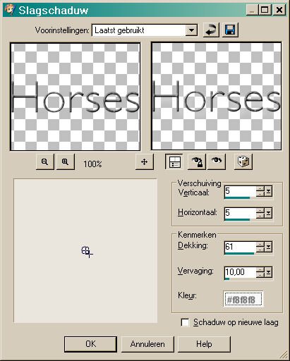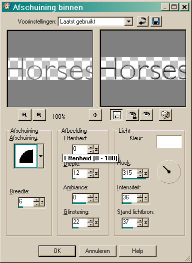12. Maak weer een nieuwe laag aan, klik weer op A en type Horses, pas weer de afschuining naar binnen toe (innerbevel) en klik op ok. Schuif de twee woorden onder elkaar (of net wat je mooi vindt.) 13. Ga naar Lagen - Samenvoegen - Zichtbare lagen samenvoegen (Layers - Merge - Merge visible) 14. Ga weer naar Afbeelding om het doek te wijzigen (canvas). Dit zijn de gebruikte instellingen: