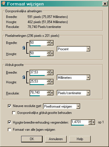 Herhaal met -5. 7. Maak het plaatje dat je zojuist hebt gekopieerd actief en kopieer het nog eens, ga terug naar het origineel en met ctrl L maak je er een nieuwe laag van. 8. Ga naar afbeelding - formaat wijzigen (image/resize)