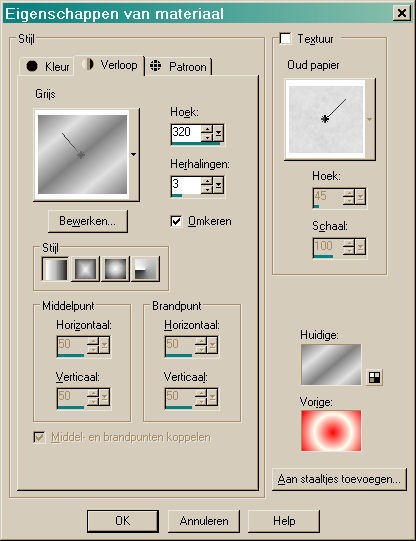 15. Klik op de transparante rand met je toverstokje (magic wand) en vul deze met Verloop Grijs. Je kunt dit vinden door eerst op het zwarte rondje te klikken met kleur. Je krijgt dan 3 rondjes te zien. Kies het middelste en dan gaat er 'n window open. Klik op het driekhoekje naast het verloop om het verloop grijs te vinden. Stel het als volgt in: