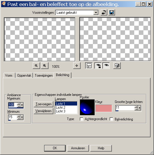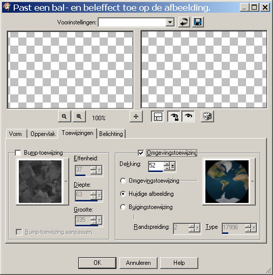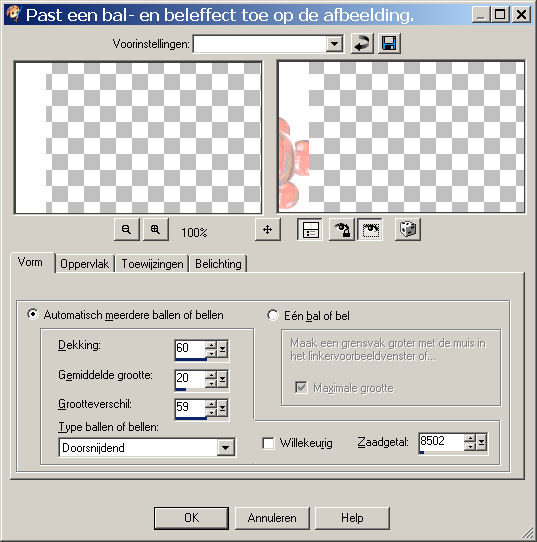 Ga naar effecten -artistieke effecten - ballen en bellen en pas de volgende instellingen toe. Let goed op de tabjes voor de