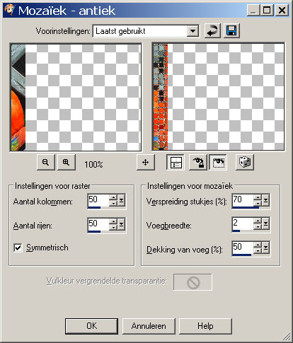 Ga naar effecten - textuur - mozaiek antique met de volgende instellingen: