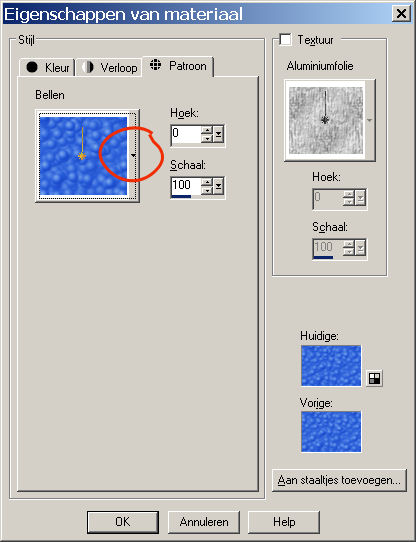 en klik op het onderste. Klik dan in het vierkantje erboven (er is een patroontje komen te staan) en als het goed is gaat er dan een nieuw schermpje open.. je klikt dan op het driehoekje naast het patroontje en