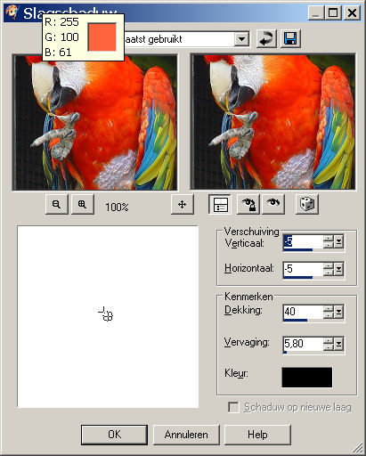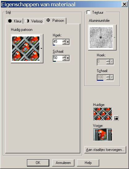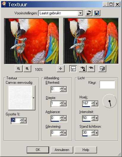 zoek het tweede plaatje van de papegaai op. Die klik je dan aan. Zet de hoek op 45, schaal op 50, voor de rest hoef je niets te doen. Klik op ok.